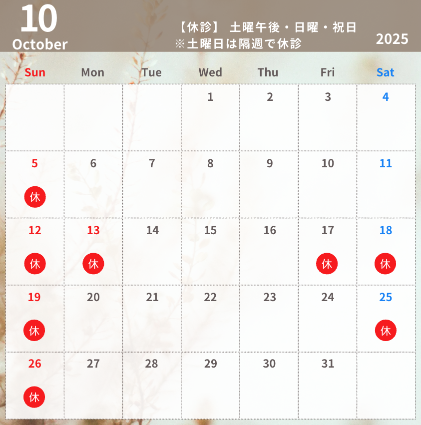 10月17日(金)、18日(土)、25日(土) は休診いたします